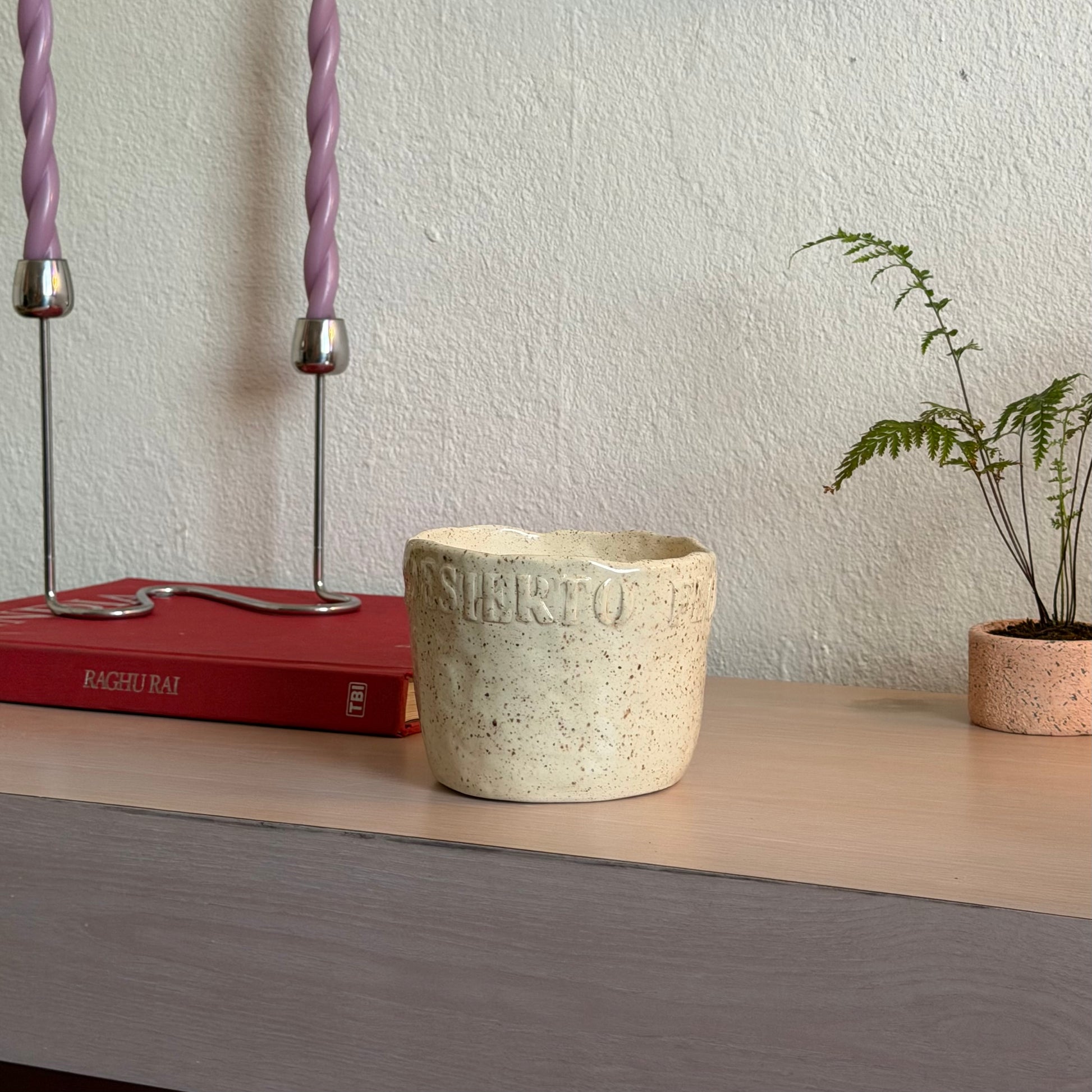 Tiesto para plantas. Dice “En el desierto florecí”