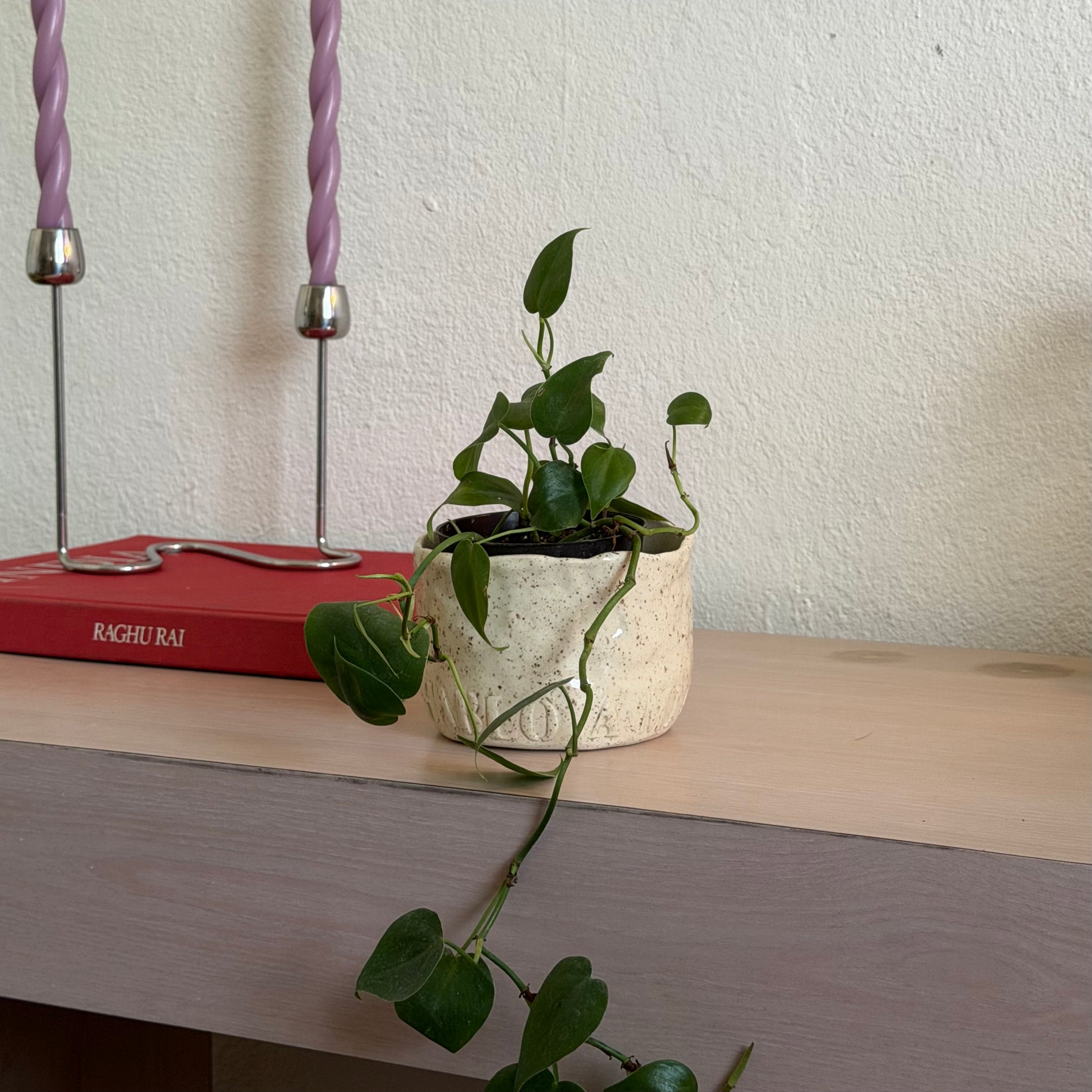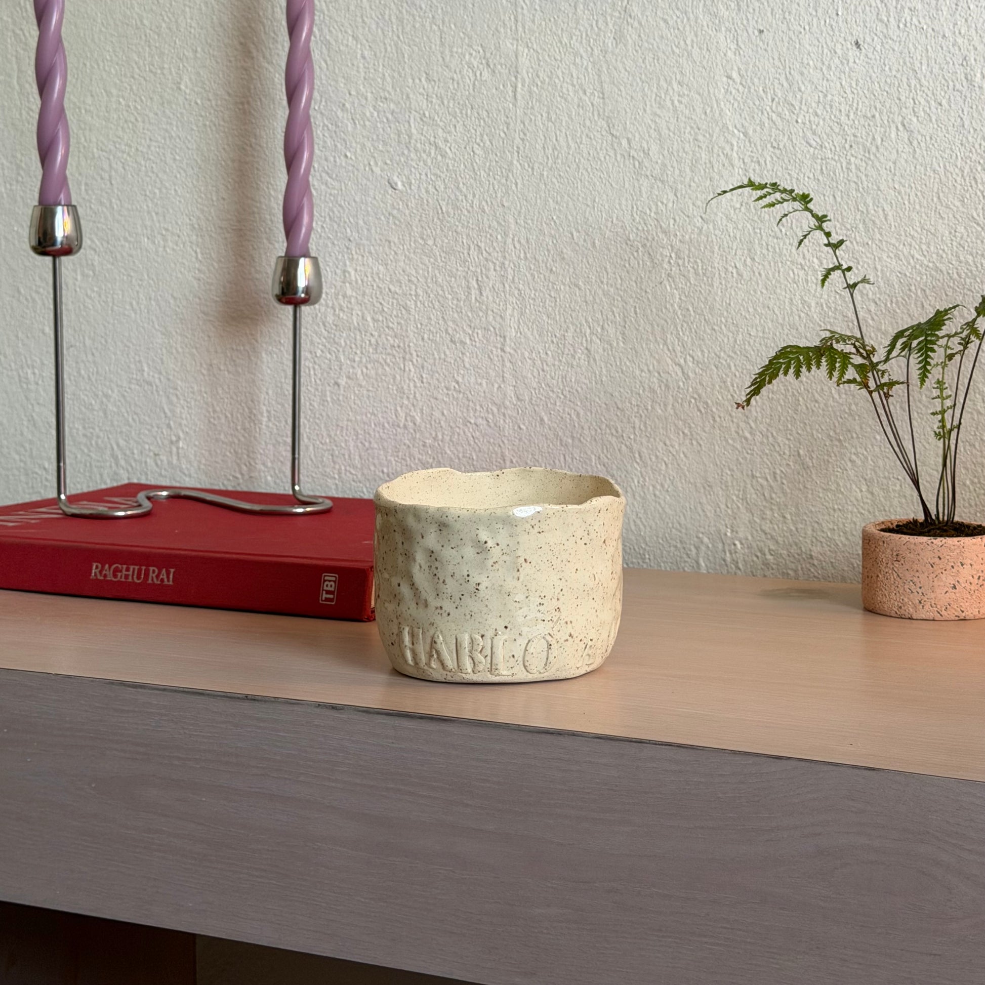 Tiesto para plantas. Dice “Habló a mi corazón”