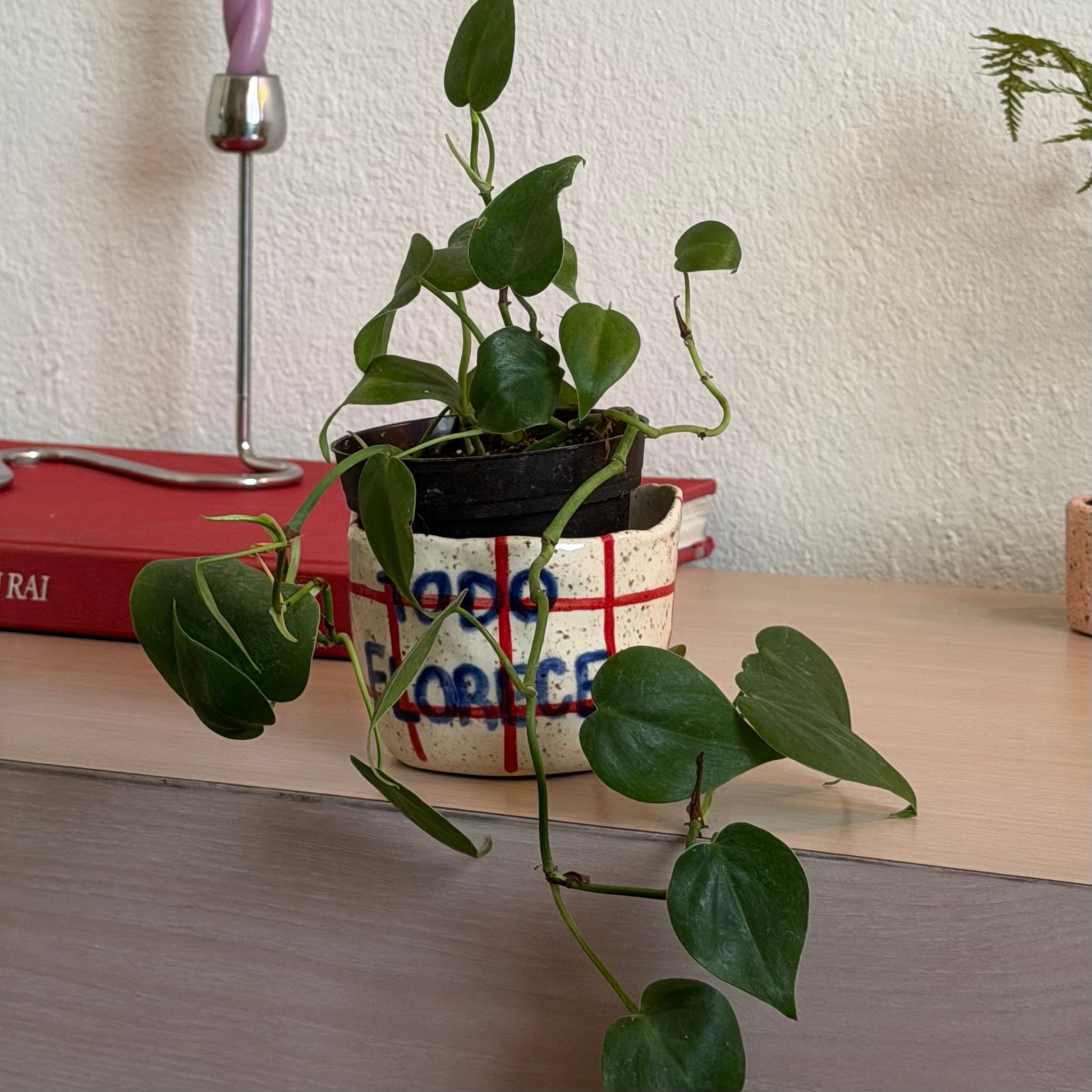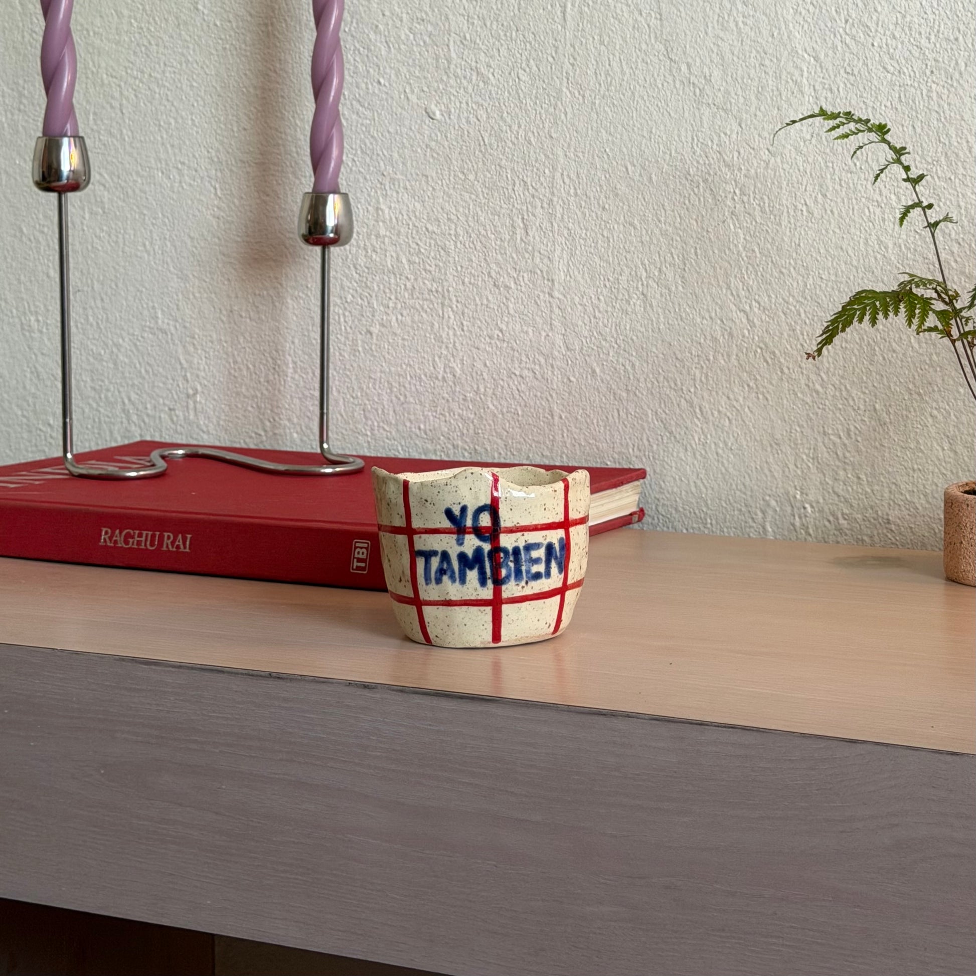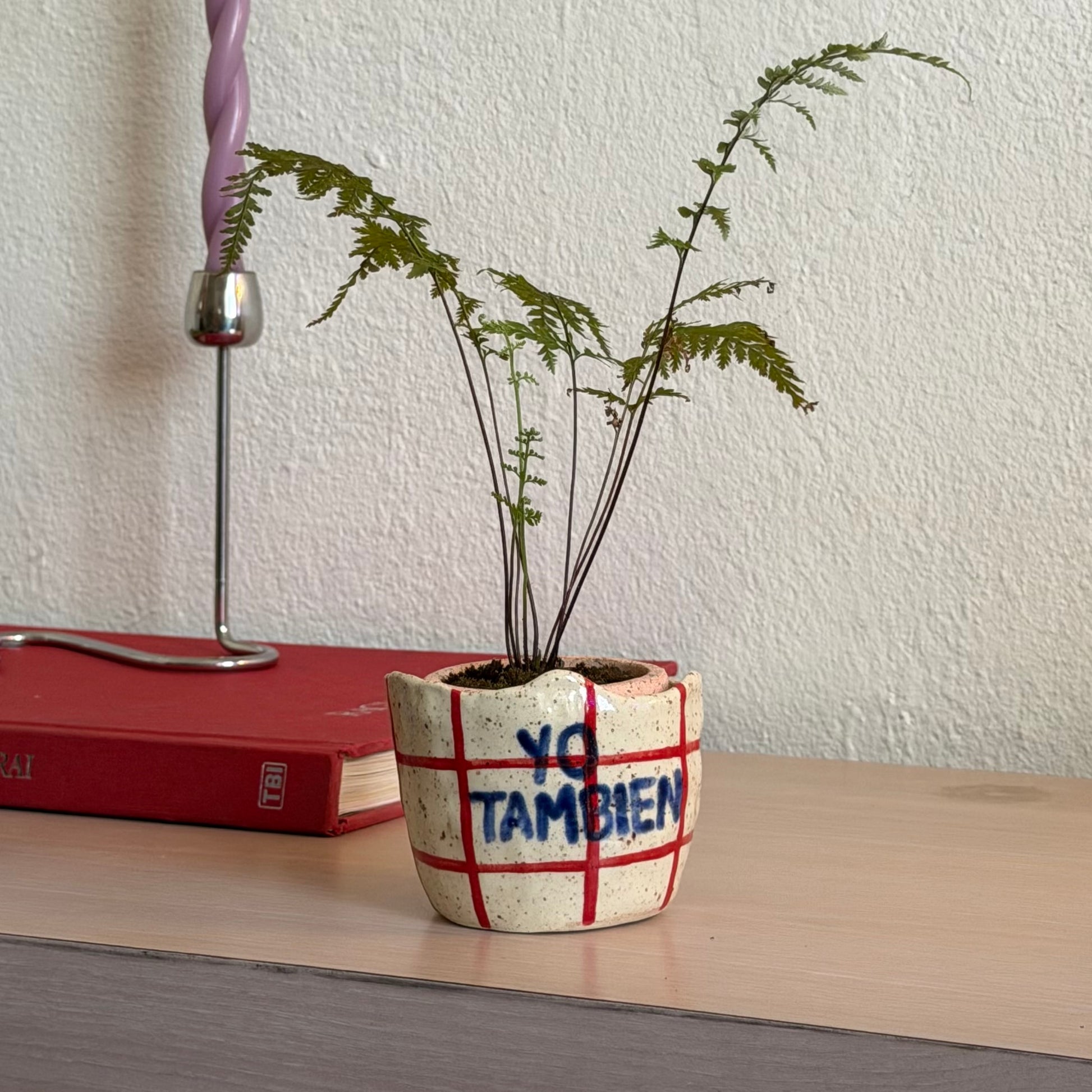 Tiesto pequeño para plantas. Dice “Todo Florece” en un lado y “Yo también” en el otro lado.